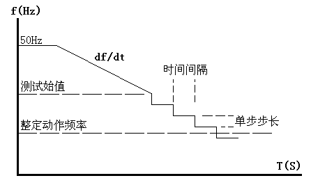 動作頻率的測試方法:測試時頻率分兩階段變化:開始以50Hz輸出,經過變化前延時后,先按所設定的df/dt均勻下滑(或上滑)至測試始值頻率,然后按設定的步長以一定時間間隔逐格降低(或上升)頻率,在該過程中如保護動作,則測出動作值。如未動作,當變化至測試終值,即認為保護不會動作而結束該項目測試。