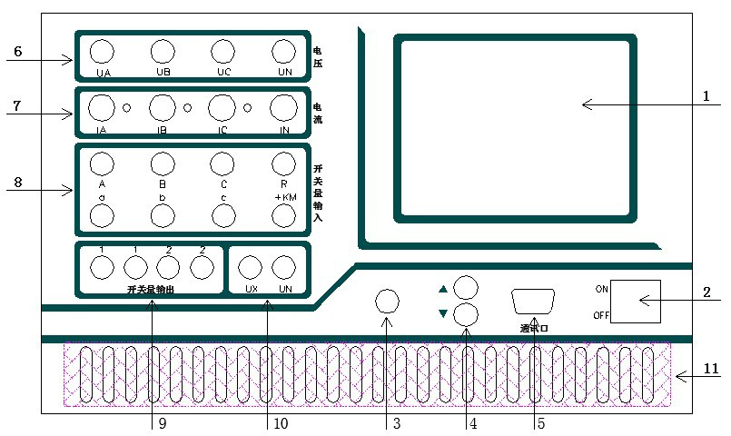 7.IA、IB、IC、IN 為電流輸出端子,各電流端子(IA、IB、IC)右側(cè)的小信號燈指示該路電流輸出是否存在波形畸變或負載開路