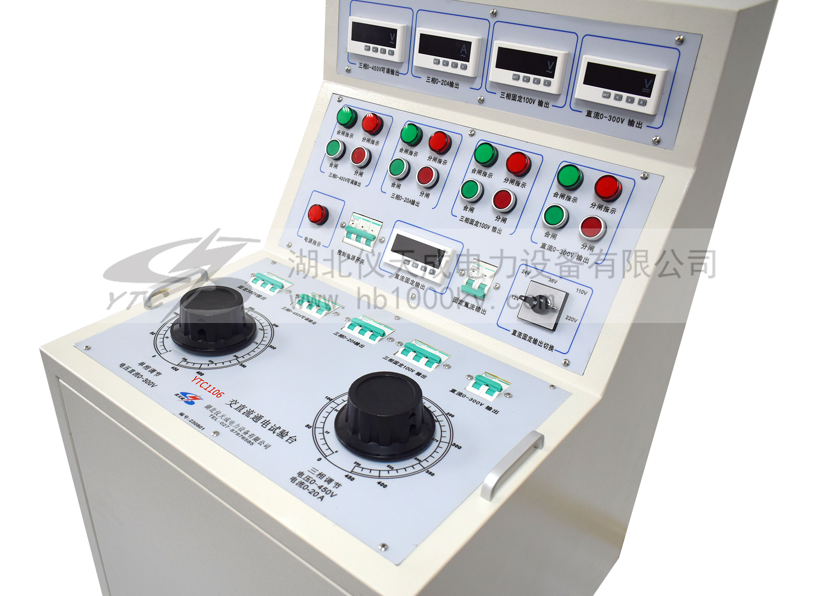 1、三相AC100V輸出(固定值) 一組 2、三相AC 0 - 50A輸出(〈10V,可調值) 一組 3、交流操作電壓輸出 AC 0 – 420V,220V時,電流小于10A 一組 4、直流操作電壓輸出24V.36Ⅴ.48Ⅴ.110Ⅴ.220Ⅴ 5、單相AC220V輸出(固定值,插座形式) 二組 6、三相AC380V輸出(固定值,接線柱) 二組 |