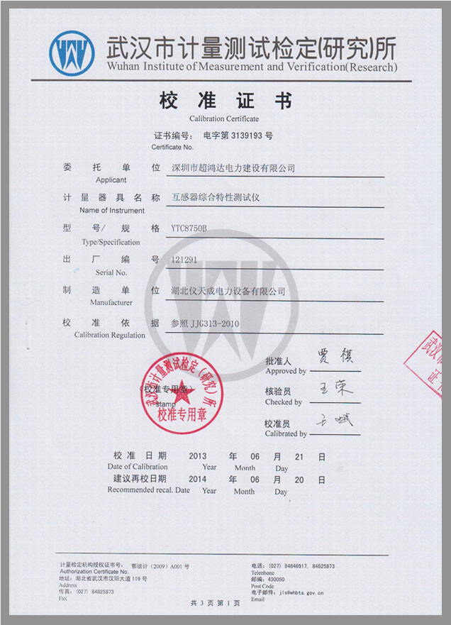 轉(zhuǎn)載:"YTC8750B互感器伏安變比極性綜合測(cè)試儀鑒定證書" 請(qǐng)注明來(lái)源于儀天成電力。 更多技術(shù)問(wèn)題請(qǐng)致電儀天成電力客戶服務(wù):027-87876585,技術(shù)部專線:027-87876585,在線客服: